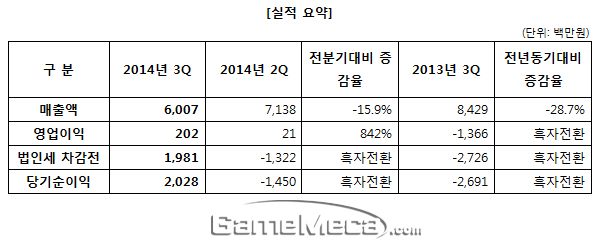 엠게임은 28일(금), 2014년 3분기에 총 매출 60억 1천만 원, 영업이익 2억 원, 당기순이익 20억 3천만 원을 기록했다고 밝혔다. 매출액은 전년 동기 28.7% 감소했으나, 영업이익과 당기순이익은 전년 동기 적자에서 흑자로 전환했다.
