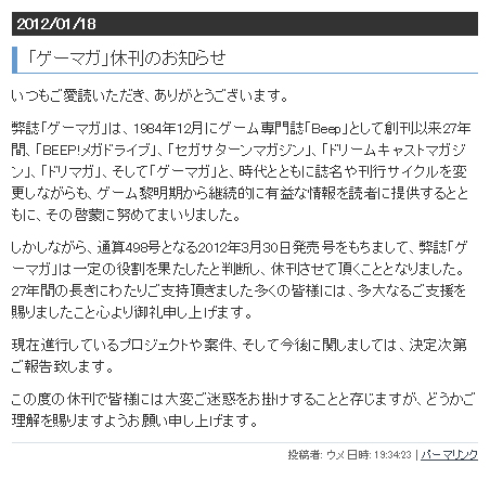 ‘게마가’ 는 “27년이라는 긴 세월 동안 보내주신 많은 성원에 진심으로 감사 드립니다. 현재 진행 중인 프로젝트와 이슈, 그리고 향후 일정은 결정되는 대로 다시 알려드리겠습니다.” 라고 밝혀 휴간 절차를 차근차근 준비하고 있음을 알 수 있다.