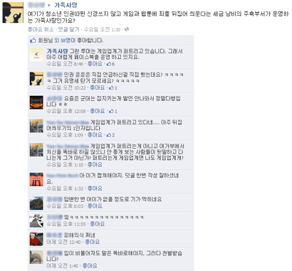 지난 1일 한 네티즌은 여성가족부의 공식 페이스북 ‘가족사랑’ 담벼락에 “여기가 청소년 인권 따윈 신경 쓰지 않고 게임과 웹툰에 죄를 뒤집어 씌운다는 세금 낭비의 주축부서가 운영하는 가족사랑인가요?”라는 글을 올렸다. 문제가 된 발언은 이에 대한 여성부 측의 답변으로, “그런 루머는 게임업계가 퍼트리고 있습니다. 그래서 아주 어렵게 페이스북을 운영하고 있지요”라는 글을 올렸다.