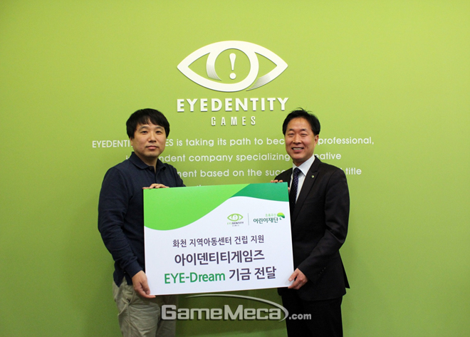 전달식에는 아이덴티티게임즈 이병국 실장이 참석해 ‘EYE-Dream 캠페인’ 기금 2천 만원을 초록우산 어린이재단 함영신 본부장에게 전달했다.