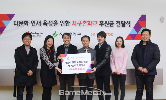 스마일게이트 희망스튜디오는 선데이토즈와 함께 다문화 아동을 위한 대안학교인 지구촌학교에 교육운영비 명목으로 후원금 1억 6,000만 원을 전달했다고 30일(화) 밝혔다.