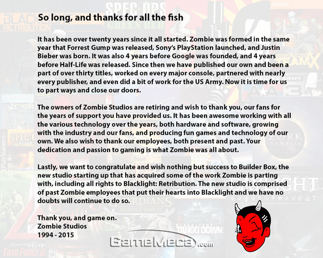 ‘스펙옵스’와 ‘블랙라이트’ 시리즈를 개발한 좀비스튜디오가 문을 닫는다.