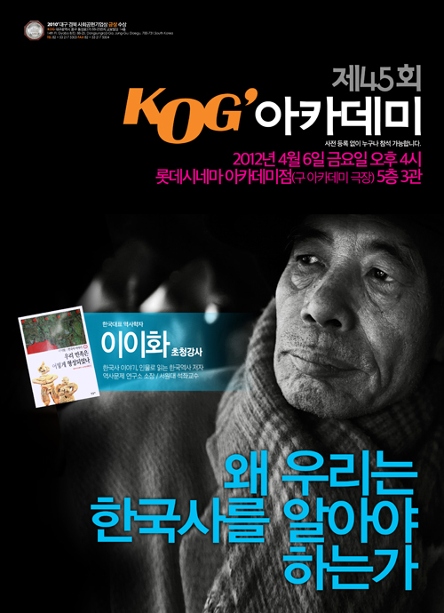 `그랜드체이스`, `엘소드`, `파이터스클럽` 을 개발한 KOG가 오는 4월 6일 오후 4시, 롯데시네마 아카데미점 5층 3관에서 `제 45회 KOG 아카데미` 를 진행한다고 금일(30일) 밝혔다. 초청강사는 역사학자 이이화 선생이며, ‘왜 우리는 한국사를 알아야 하는가’ 를 주제로 강연한다.