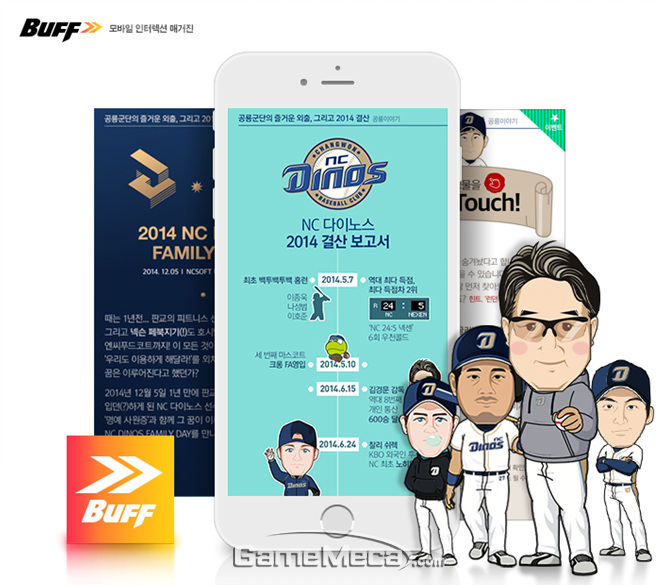 '버프'는 엔씨소프트의 게임 정보와 프로야구단 NC 다이노스의 소식을 전하는 모바일 애플리케이션이다. 이번에 발간되는 특집호 부제는 ‘공룡 군단의 즐거운 외출과 그들의 2014 결산’으로, 지난해 12월 엔씨소프트 판교R&D센터에서 열린 ‘NC DINOS FAMILY DAY’ 행사 내용을 확인할 수 있다. 이 외에 2014년 정규리그 3위을 달성한 NC 다이노스의 각종 기록을 인포그래픽에 담았고, 2015 스프링캠프 탐방기에 대한 소식도 미리 전해들을 수 있다.