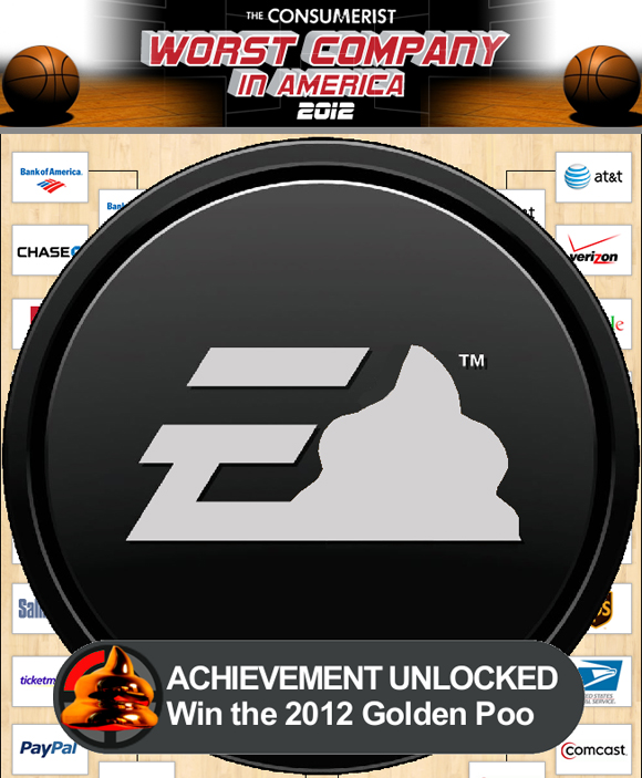 미국의 소비자 전문매체인 ‘컨슈머리스트’는 4일(현지시간) 2012년 ‘최악의 기업’으로 EA를 선정했다. 총 25만명이 참여한 이번 콘테스트에서 EA는 뱅크아메리카와의 치열한 공방 끝에 우승 트로피인 ‘황금똥상’을 거머쥐었다. EA와 뱅크아메리카 외에도 소니, 월마트, 게임스톰, 애플, 그리고 페이팔 등이 결승 후보에 이름을 올랐다.