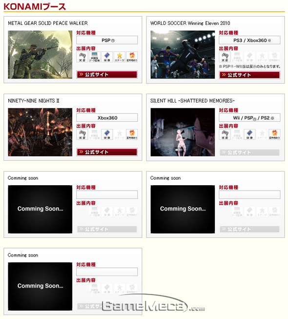 이번에 새롭게 공개된 라인업은 Xbox360 진영의 ‘나인티 나인 나이츠 2’와 Wii, PS2, PSP로 출시될 예정인 ‘사일런트 힐: 기억의 조각들’ 총 두 편이다. 15일 추가 공개된 2가지 타이틀 외에 PSP용 ‘메탈기어 솔리드: 피스 워커’와 PS3, Xbox360 타이틀 ‘위닝 일레븐 2010’이 먼저 공개되어 있었으며, 나머지 3개의 출품작은 아직 비공개 이미지 처리되어 있는 상태다.