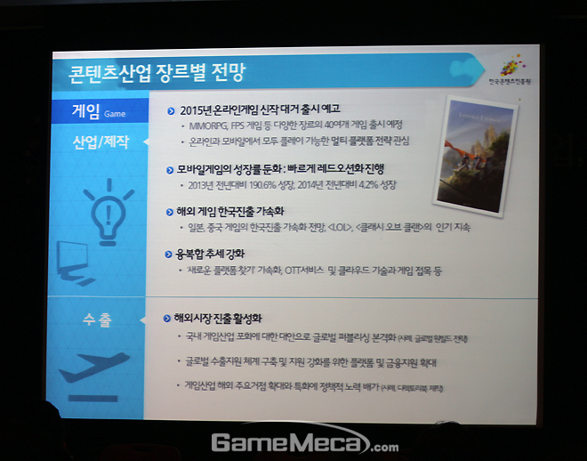 정부가 2015년에 '해외 진출'에 집중하는 것 역시 이러한 이유에서 비롯된다. 한국콘텐츠진흥원 강익희 산업정책팀장은 "국내 게임시장이 포화상태에 이름에 따라 글로벌 퍼블리싱이 본격화될 것으로 보인다. 따라서 글로벌 수출지원 체계를 구축하고, 주요 거점을 확보하는 것을 계획하고 있다"라고 말했다.