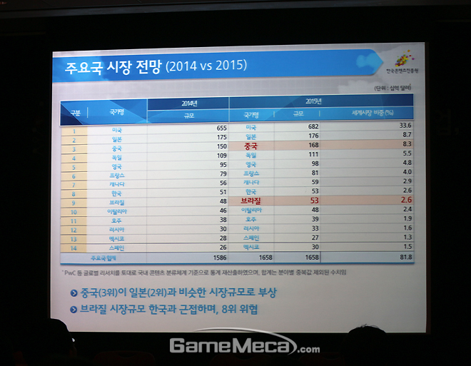 북미, 중국, 일본, 동남아 등 주요국 외에 정부가 주목하고 있는 지역은 신흥 시장은 중남미다. 한국콘텐츠진흥원 윤재식 수석연구원은 "올해 중남미 권역에서는 게임이 11.4%로 지식정보, 방송과 함게 고성장을 기록했으며, 2015년에도 5% 이상 성장률을 기록하며 콘텐츠시장의 중요한 견인차 역할을 할 것으로 보인다"라고 말했다.