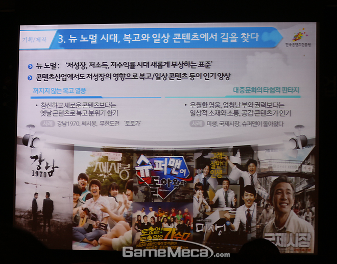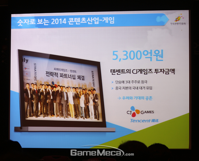 한국콘텐츠진흥원 송성각 원장은 "지난해 콘텐츠산업은 문화융성과 창조경제라는 정부 기조 하에 큰 주목을 받았다. 그러나 한편으로는 중국이 막강한 자본력을 앞세워 제작 노하우와 인력을 빼가고 있으며, 각종 규제를 동원해 자국 내 한류 콘텐츠의 맥을 막고 있다. 과몰입 경쟁과 중국의 역습으로 힘들어하는 게임이 대표적인 사례다"라고 말했다.