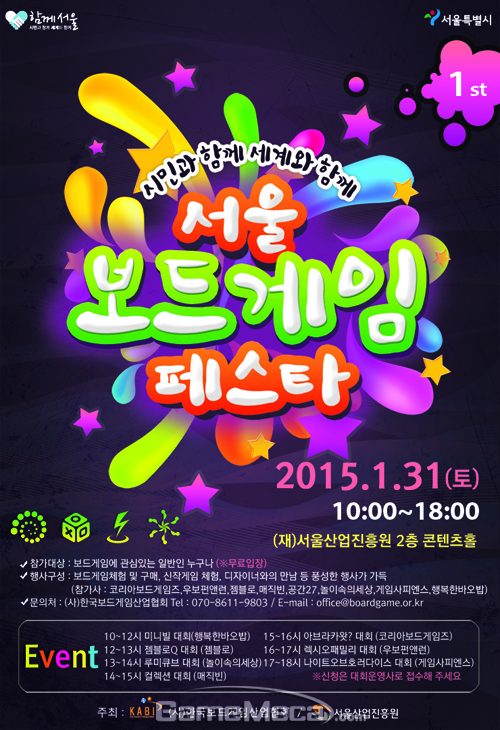 올해 처음으로 개최되는 서울보드게임페스타는 오는 31일 상암동 서울산업진흥원에서 열리며, ‘시민과 함께 세계와 함께 ‘라는 슬로건을 걸고 국내외 유명 보드게임은 물론 신작 게임을 직접 체험할 수 있는 ‘열린 파티’로 누구나 참가할 수 있다.