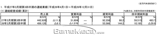이에 따라 2014년 4월부터 12월까지의 회계연도 2014년 4분기(일본 기준 3분기) 누적 실적도 호조를 보였다. 닌텐도 누적 매출은 전년 동기 대비 66.2% 증가한 4429억 2000만 엔(약 4조 984억 원)을 기록했다. 누적 영업이익은 316억 400만 엔(약 2924억 원), 누적 당기순이익은 595억 1500만 엔(약 5507억 원)이다. 특히 당기순이익은 전년 동기 대비 483.7% 증가되며 대폭 상승했다.