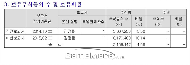 게임업계 ‘큰 손’으로 볼리는 김정률 전 그라비티 회장이 지난해에 이어 또 다시 바른손이앤에이 지분 4.58%를 매입했다.