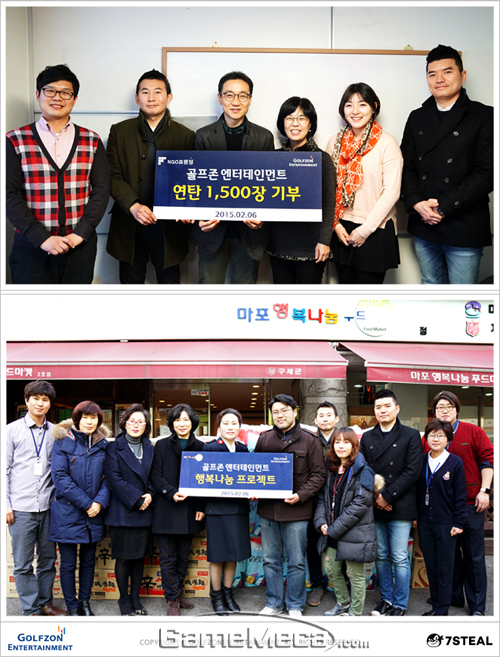 골프존엔터테인먼트는 2014년 한 해 동안 다채로운 사내 행사와 임직원들의 자발적인 기부 등을 통해 이웃돕기 성금을 마련해왔으며, 다가오는 설 명절을 앞두고 지난 2월 6일(금) ‘마포행복나눔푸드마켓 2호점’과 청소년NGO ‘프렌딩(FRIEND+ING)’을 방문해 온정의 손길을 전달했다.