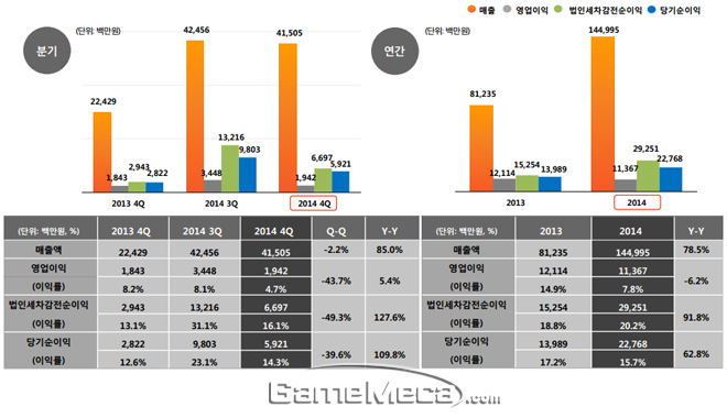 반면, 분기 실적은 모두 상승세를 보였다. 2014년 4분기에는 매출 415억 원과 영업이익 19억 원을 기록해, 분기 매출은 전년 동기 대비 85% 상승했고 영업이익도 전년 동기 대비 5.4% 올랐다. 특히 전년 동기 대비 국내 매출은 175%, 해외 매출은 23% 증가했다. 국내에서는 ‘별이되어라!’와 ‘이사만루 2014 KBO’가 꾸준한 매출원으로 활약했으며, 해외에서는 '크리티카’, ‘다크어벤저 2’, ‘엘룬사가’ 등의 신작들이 가세한 덕분이다. 또한 동남아 지역에서의 성장도 꾸준히 이어지고 있다.