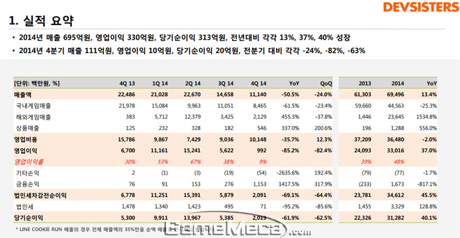 데브시스터즈는 12일(목), 2014년 연간 실적을 발표했다. 2014년 한 해 데브시스터즈는 총 매출 649억 원, 영업이익 330억 원을 기록했다. 매출은 전년 대비 13.37%, 영업이익은 전년 대비 37% 상승했다.