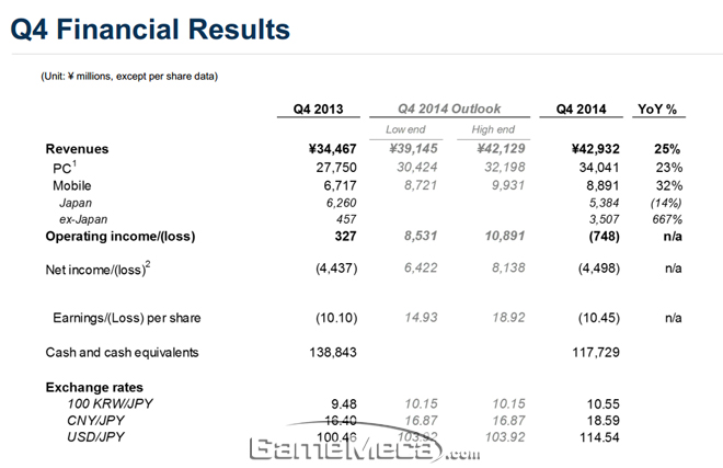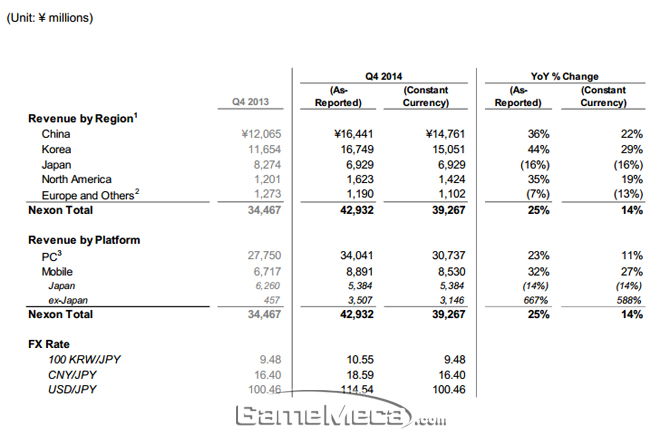넥슨의 2014년 4분기 실적도 공개됐다. 매출은 429억 3,200만 엔(한화로 4,69억 원)으로 전년 동기 대비 25% 늘었으며, 영업손실과 순손실은 각각 7억 4,800만 엔(71억 원), 44억 9,800만 엔(426억 원)으로 전년동기대비 적자 전환했다. 한국과 중국 지역 매출이 각각 39%, 38%로 둘을 합치면 77%의 비중을 차지한다. 특히 일본과 유럽 및 기타 지역은 2013년 동기보다 16%, 7% 줄어들었다. 한국 지역 매출은 167억 엔으로 전년 동기 대비 44% 증가했다.