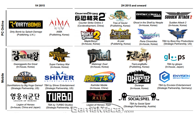 보스키 프로덕션, 실버 엔터테인먼트, 터보 스튜디오, 빅 휴즈 게임즈 등 넥슨이 그간 투자해온 해외 개발사들의 타이틀이 대거 등장한다. 해외 개발사들의 작품을 앞세워 한국과 중국에 집중된 매출 구조를 다각화하겠다는 것이 넥슨의 계획이다. 넥슨은 “2015년부터 품질 좋은 온라인게임 및 모바일게임을 구미 시장(유럽 및 아메리카)에 출시할 것이다”라고 덧붙였다.