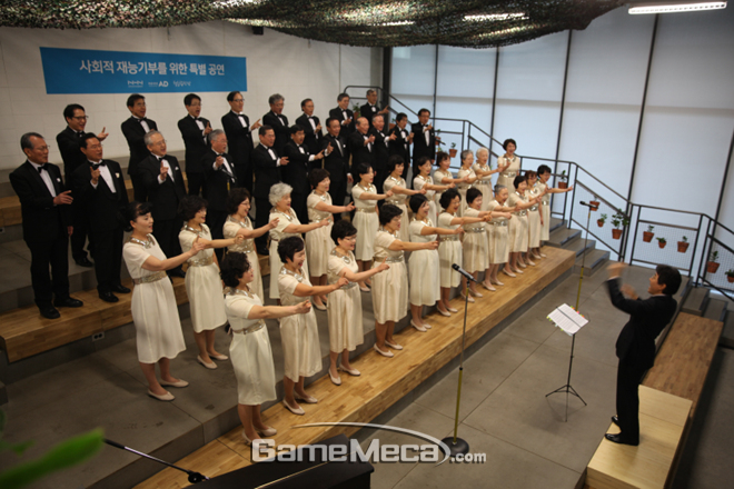 NHN엔터테인먼트AD은 24일 판교에 위치한 NHN엔터테인먼트 사옥에서 청춘합창단이 도전을 실현할 수 있도록 마케팅 재능기부를 약속하는 협약식을 진행하고 축하 공연을 가졌다고 밝혔다.