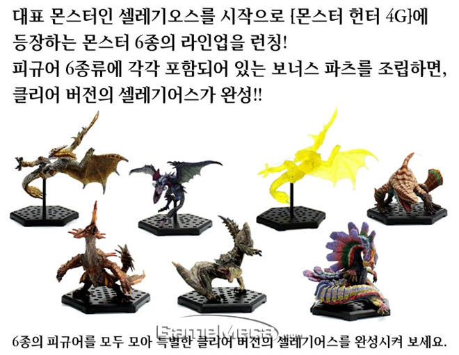 특히 ‘몬스터 헌터 스탠다드 모델 Plus Vol.1’은 몬스터 헌터 시리즈에서 인기가 높은 몬스터 중 하나인 ‘천인룡 셀레기오스’를 메인으로, ‘모노브로스’, ‘양가루루가’, ‘티가렉스 아종’, ‘자보아자길 아종’, ‘가라라아쟈라 아종’등 총 6종류의 몬스터로 구성됐다. 제품 박스 구매 시에는 획득한 피규어에 따라 각기 다른 보너스 파츠가 제공되며, 이를 모두 모으면 셀레기오스의 클리어 버전을 완성할 수 있다.