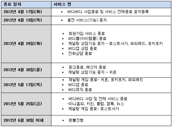 `버디버디` 는 오늘(19일)부터 캐쉬 충전 서비스를 중지하고, 5월 25일까지 각종 서비스를 단계적으로 폐지한 후 최종적으로 6월 30일까지 환불 절차를 진행할 예정이다.