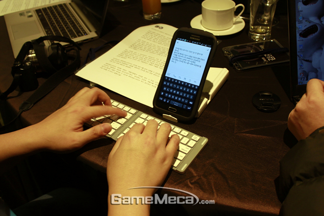 ▲ 에픽게임스코리아 기자 간담회 현장 사진: 13일 열린 '언리얼 엔진 4' 출시 1주년 간담회, 모바일 시대에 맞춰 스마트폰과 블루투스 키보드로 작업 중인 한 기자의 모습. 이동이 많은 취재 기자에게 딱이네요.