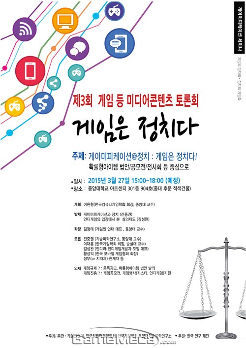 진행은 김정태 게임인연대 교수가 참석하며, 발제는 동양대 진중권 교수와 김성완 인디게임개발자 모임 대표가 발제를 맡는다. 진 교수는 '정치와 게이미피케이션', 김성완 대표는 '인디게임의 입장에서 본 심의제도'를 주제로 삼았다.