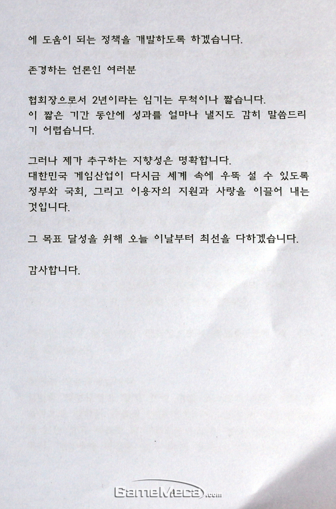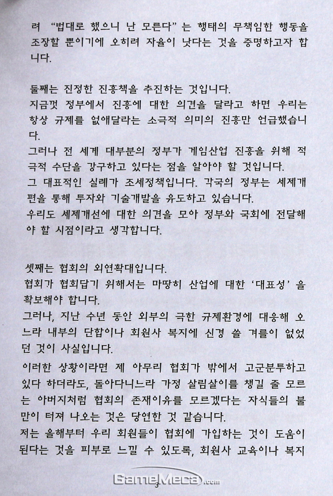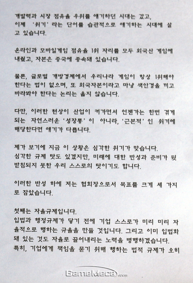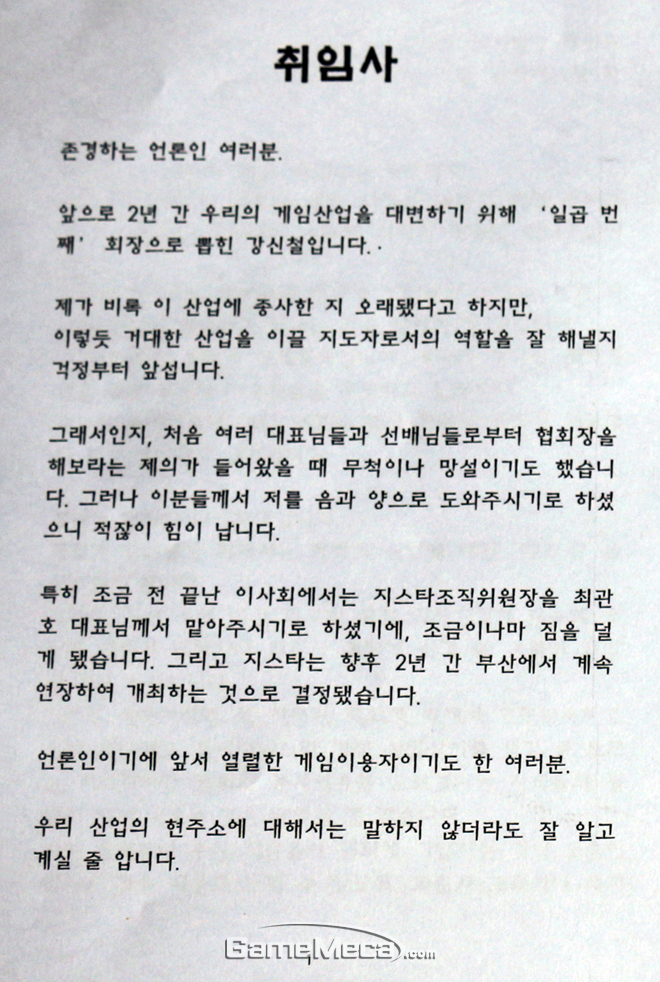 ▲ 한국인터넷디지털엔터테인먼트협회 강신철 협회장 취임사: 한국인터넷디지털엔터테인먼트 강신철 신임 협회장이 4월 8일 취임했습니다. 강 협회장은 본인이 직접 작성한 취임사를 통해 앞으로의 각오를 밝혔죠. '언론인이기에 앞서 열렬한 게임이용자이기도 한 여러분'이라는 친숙한 멘트가 눈에 뜨이는군요. '확률형 아이템 자율규제'를 올해 안에 안착시켜야 한다는 중대한 과제를 앞둔 와중, 개발자 출신으로서 협회장 역을 맡게 된 강 협회장의 굳은 의지가 엿보이는군요.
