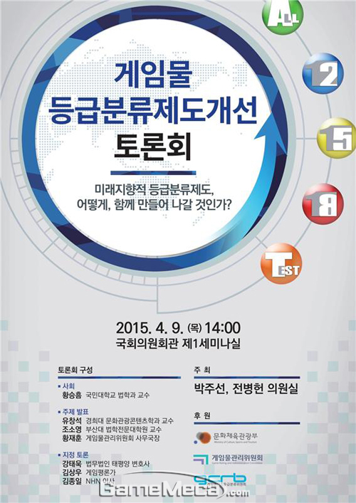 국회 교육문화체육관광위원회 소속 박주선 의원은 전병헌 의원과 함께 4월 9일 (목) 오후 2시 국회의원회관 제1세미나실에서 '게임물 등급분류제도개선 토론회 – 미래지향적 등급분류제도, 어떻게, 함꼐 만들어 나갈 것인가?'를 주제로 토론회를 개최한다. 토론회는 문화체육관광부, 게임물관리위원회, 게임콘텐츠등급분류위원회가 후원한다.