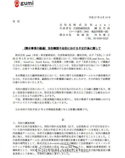 구미 측은 “자회사에서 부정 행위가 행해진 것은 대단히 유감이며 주주와 투자자를 비롯해 거래처 및 관계자들에게 막대한 폐와 걱정을 끼쳐 드린 것을 진심으로 사과한다”고 밝혔다.