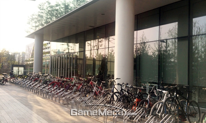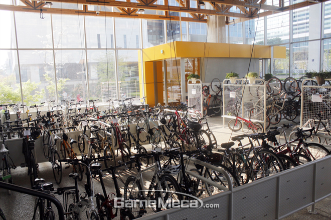 ▲ NHN엔터테인먼트와 엔씨소프트 자전거 주차장: 최근 자전거로 출퇴근하는 직장인이 늘어나고 있는데요. 이런 점은 게임사도 마찬가지입니다. 특히 NHN엔터테인먼트와 엔씨소프트는 자전거 전용 주차 공간까지 마련해놨는데요. 주차된 자전거의 숫자만 봐도 얼마나 많은 직원들이 자전거로 출퇴근을 하고 있는지 느껴지네요 "에너지 절약도 하고 건강도 챙기고 아자~ ㅎㅎ"