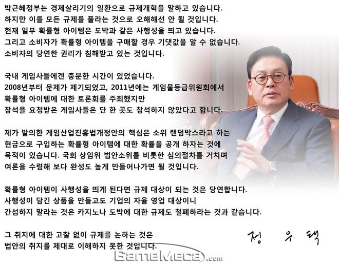 다만, 앞서 말했듯이 ‘확률형 아이템 규제’는 6월 국회 상정 가능성이 높다. 법안 통과에 대한 정우택 의원의 의지는 확고하다. 정 의원은 법안 발의 뒤에도 본인의 페이스북을 통해 법안의 필요성을 강조해왔다.