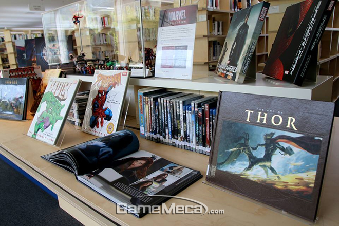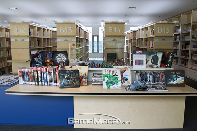 ▲ 엔씨소프트 도서관 사진: ‘어벤져스 2’가 23일 개봉했는데요. 개봉 첫날 집계된 사전 예매 수만 100만에 육박할 정도로 많은 인기를 끌고 있었습니다. 이런 관심은 게임 업계도 마찬가지입니다. 바로 엔씨소프트가 사내 도서관에 ‘어벤져스 2’ 개봉 기념으로 마블 코너를 구성한 것이죠. 이런 모습만 봐도 ‘어벤져스 2’에 대한 관심도가 얼마나 높은지 알 수 있네요.