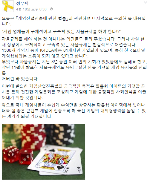 ▲ 정우택 의원의 확률형 아이템에 대한 의견을 밝혔다 (사진출처: 정우택 의원 페이스북)
