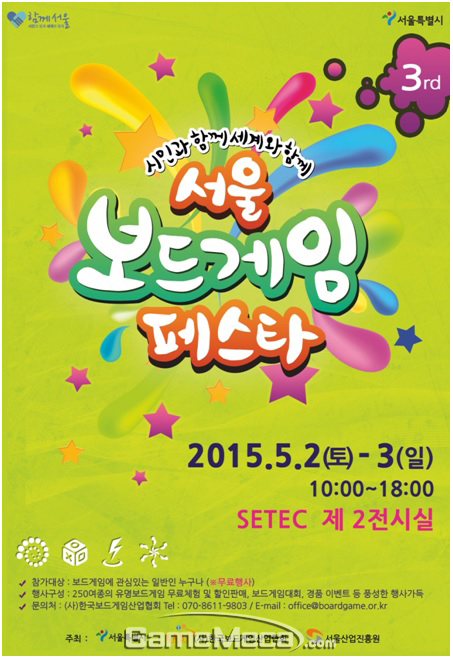 서울시, 한국보드게임산업협회, 서울산업진흥원 공동 주최로 오는 5월 2일부터 3일까지 대치동 세텍에서 제 3회 ‘서울보드게임페스타’를 개최한다고 밝혔다.
