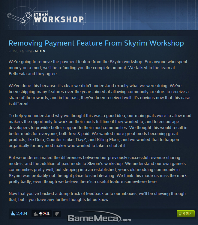 밸브는 28일(화), 스팀 공지를 통해 ‘스카이림’ 모드 유료 판매 정책이 자신들의 실수였음을 인정하고 지난 나흘간 모드 판매 수익 전액을 환불 조치한다고 알렸다. 자신들의 본의는 모드 유료화를 통해 제작자들이 창작 활동에 온전히 집중할 수 있도록 돕자는 것이었으나, ‘스카이림’ 모드 커뮤니티에 대한 이해 부족으로 이 같은 문제를 초래했다는 것이다.