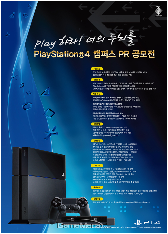 한편 PS4 캠퍼스 PR 공모전에 대한 자세한 사항은 공모전 전용 홈페이지(바로가기)를 통해 확인하거나 운영사무국(02-360-4634)을 통해 문의할 수 있다.