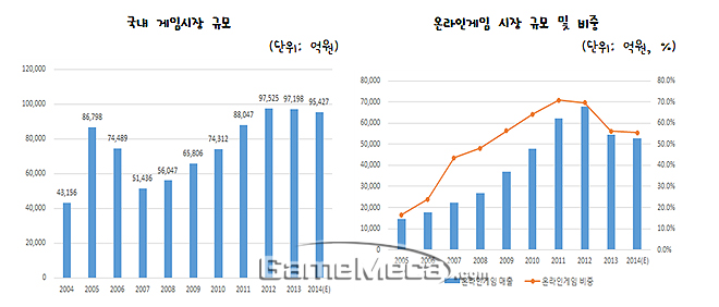 ▲ 연간 국내 게임시장 규모와 온라인게임 규모 및 비중 표