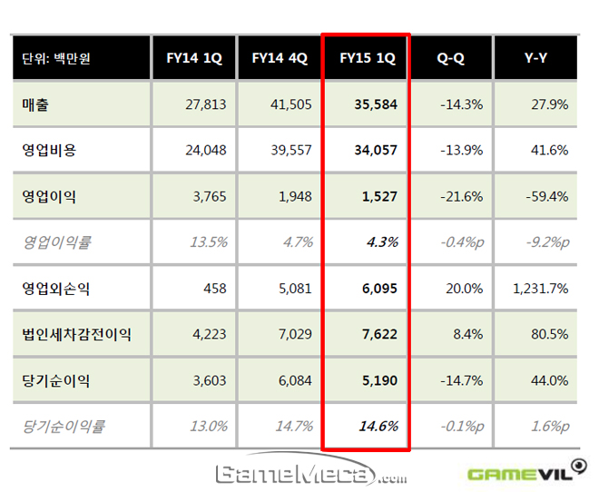 게임빌은 12일(화), 공시를 통해 2015년 1분기 실적을 발표했다. 자료에 따르면 게임빌은 이번 분기에 매출 356억 원과 영업이익 15억 원을 기록했다. 매출은 전년 동기 대비 28% 성장했으나, 영업이익은 전년 동기 대비 59.4% 감소했다.