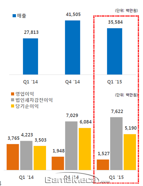 이는 '별이되어라!'처럼 지급수수료 비중이 큰 작품의 수익이 매출의 대부분을 차지한 데서 비롯됐다. 여기에 1분기 신작이 많지 않았던 것도 한 몫 했다. '크리티카'와 '이사만루 2015 KBO' 등 기존 작품의 매출은 견조했으나 새로운 매출원을 확보하지 못한 것이다.