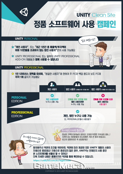 '유니티 클린 사이트' 캠페인은 유니티 엔진 사용에 대한 안내사항과 주의사항을 알기 쉽게 정리해 유니티 개발자 커뮤니티 및 개발사에 배포, 국내 유니티 유저들이 정품 소프트웨어에 보다 쉽게 접근할 수 있도록 만드는 캠페인이다.