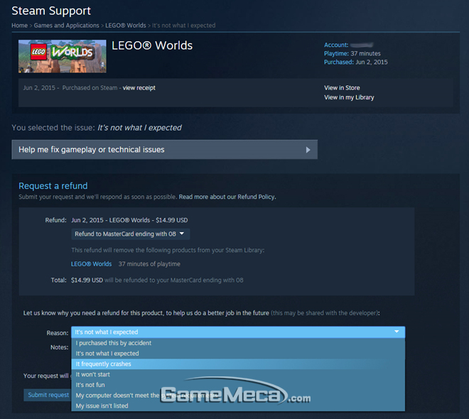 ▲ 스팀 환불 요청 웹페이지 (사진출처: 공식 웹사이트)