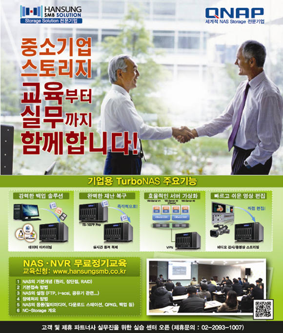 그러나 차세대 스토리지인 NAS의 기술에 대한 경험과 정보 부족으로 사용자 및 기업 담당자가 도입과 운영에 애로사항이 있을 수 있다. 이에 한성SMB솔루션은 업계에서 유일하게 매월 NAS 및 NVR(스토리지 통합 감시 솔루션) 무료 정기 교육을 교차로 시행하고 있다.
