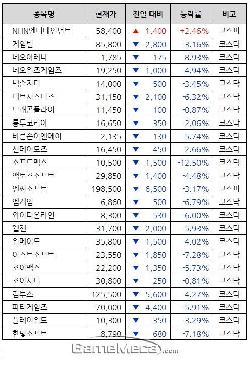 이런 상황은 모바일게임사도 마찬가지다. 게임빌은 전일 대비 3.16% 하락하며 8만 5,800원으로 장을 마쳤으며, 컴투스도 4.27% 하락한 12만 5,500원을 기록했다.