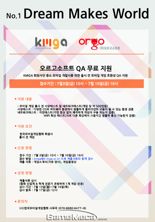 한국모바일게임협회 회원사 중 출시를 앞둔 모바일게임은 협회 대표 이메일(kmga@k-mga.or.kr)로 접수하면 된다. 협회는 업계 및 학계 전문가들을 초빙해 1개 게임을 선정하고, 선정된 게임을 오르고소프트로 전달해 QA 무료 지원을 받을 수 있도록 한다.