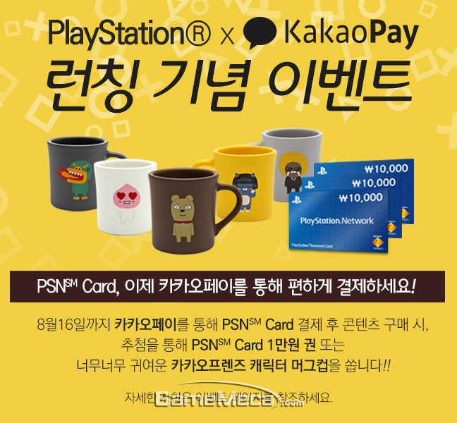 소니컴퓨터엔터테인먼트코리아는 카카오페이 결제 서비스 론칭을 기념해 8월 16일까지 카카오페이를 통해 PSN 카드를 구매한 유저들을 대상으로 이벤트를 진행한다. 참여 방법은 1만원 이상 콘텐츠를 구매한 뒤 이벤트 응모란에서 응모하기 버튼을 누르면 된다. 이 중 선정된 유저에게 PSN 카드 1만원 권(300명) 또는 카카오프렌즈 캐릭터 머그컵(200명)이 증정된다. 당첨자는 8월 21일 이후 PlayStation® 공식 블로그(바로가기)를 통해 발표될 예정이다.