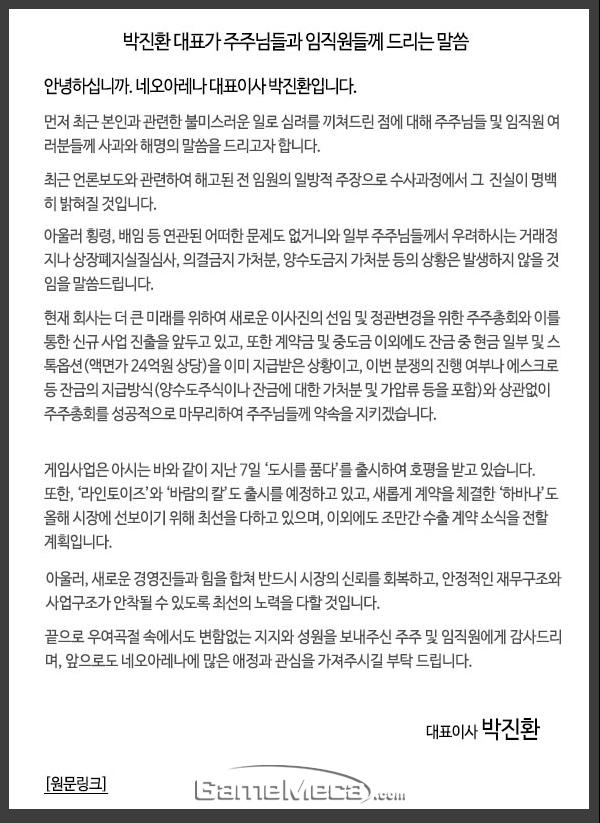 최근 논란이 되고 있는 네오아레나 지분 횡령 혐의에 대해 박진환 대표가 입을 열었다. 차경훈 전 부사장의 주장이 사실이 아니라는 것이다.