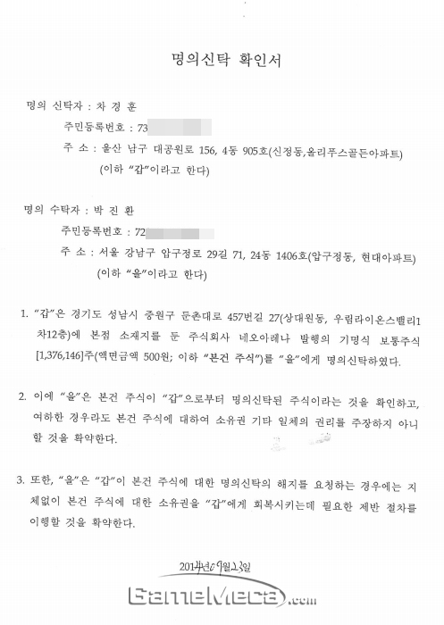 ▲ 명의신탁 확인서 (자료제공: 네오아레나)
