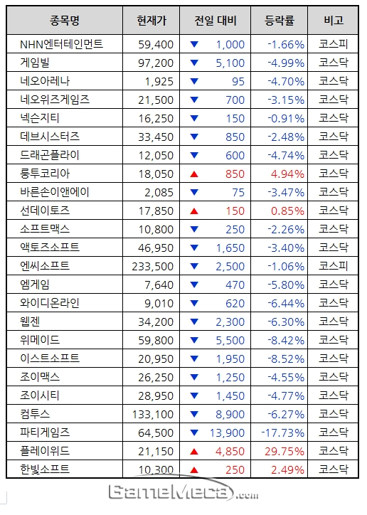 그나마 룽투게임즈의 한국 지사인 룽투코리아가 전일 대비 4.94% 오른 18,050원으로 장을 마감하며 하락세를 피했다. 선데이토즈와 한빛소프트도 각각 0.85%와 2.49% 소폭 상승했다.