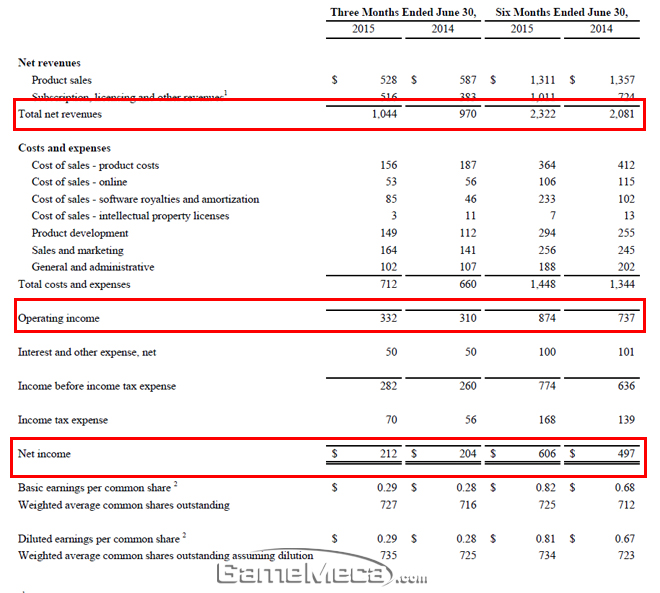 ▲ 액티비전 블리자드 2015년 2분기 실적 (자료제공: 액티비전 블리자드)
