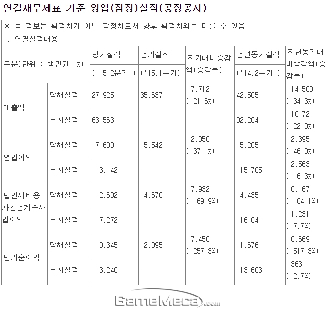 사업 부문별로 살펴보면 온라인게임 매출은 전년 동기 대비 28% 감소한 185억 원을 기록했다. 이는 ‘이카루스’와 ‘미르의 전설 2’, ‘미르의 전설 3’ 서비스가 6월 타 업체로 이관 됐기 때문이다. 이외에도 ‘실크로드’와 ‘디지몬마스터즈’ 등 온라인게임의 매출이 전반적으로 하락했다. 반면, ‘로스트사가’는 전년 동기 대비 9% 가량 매출이 증가했다.